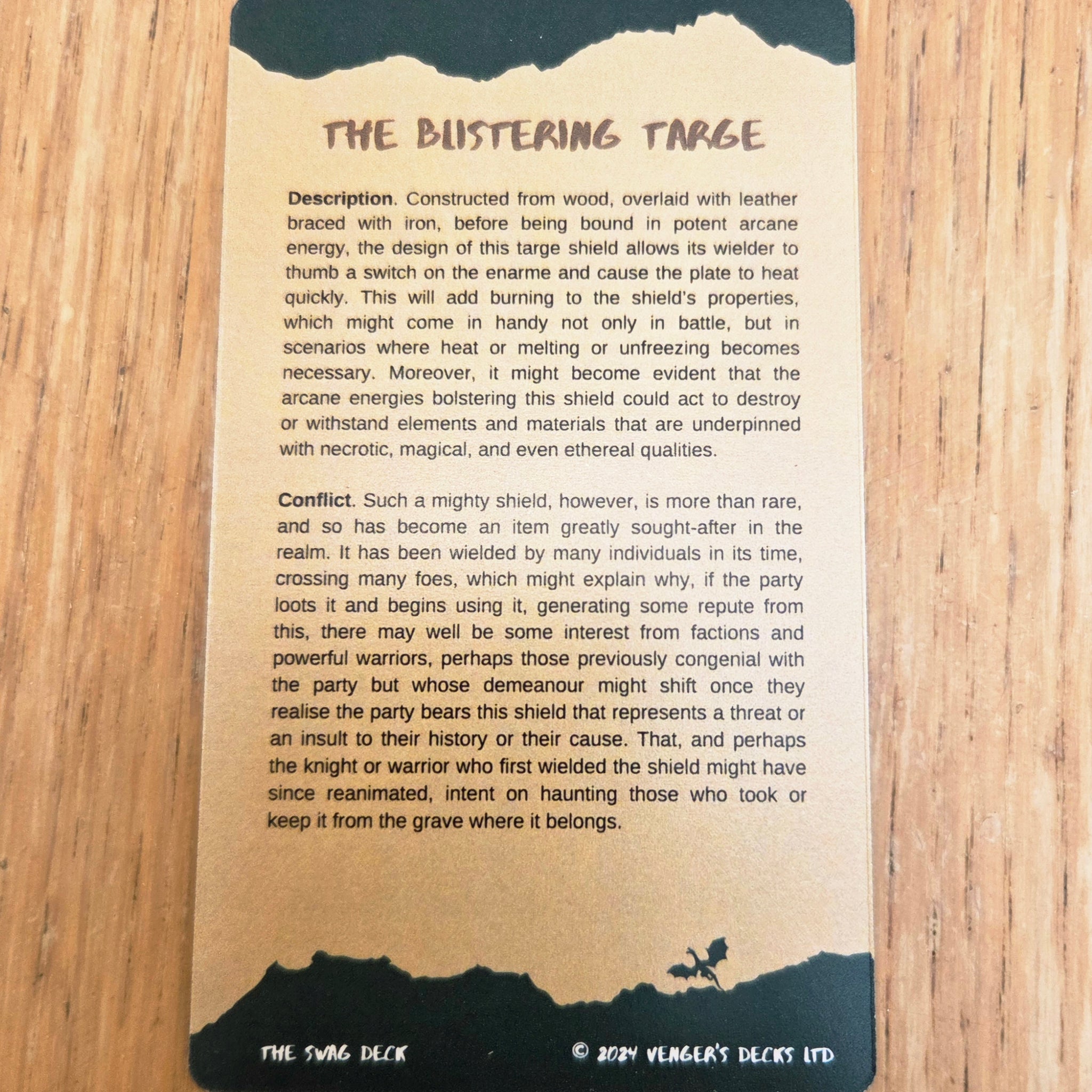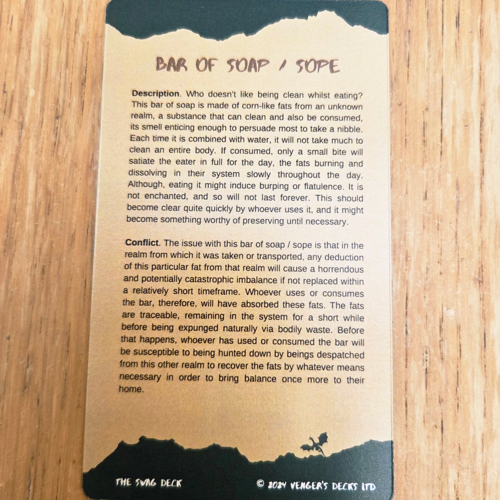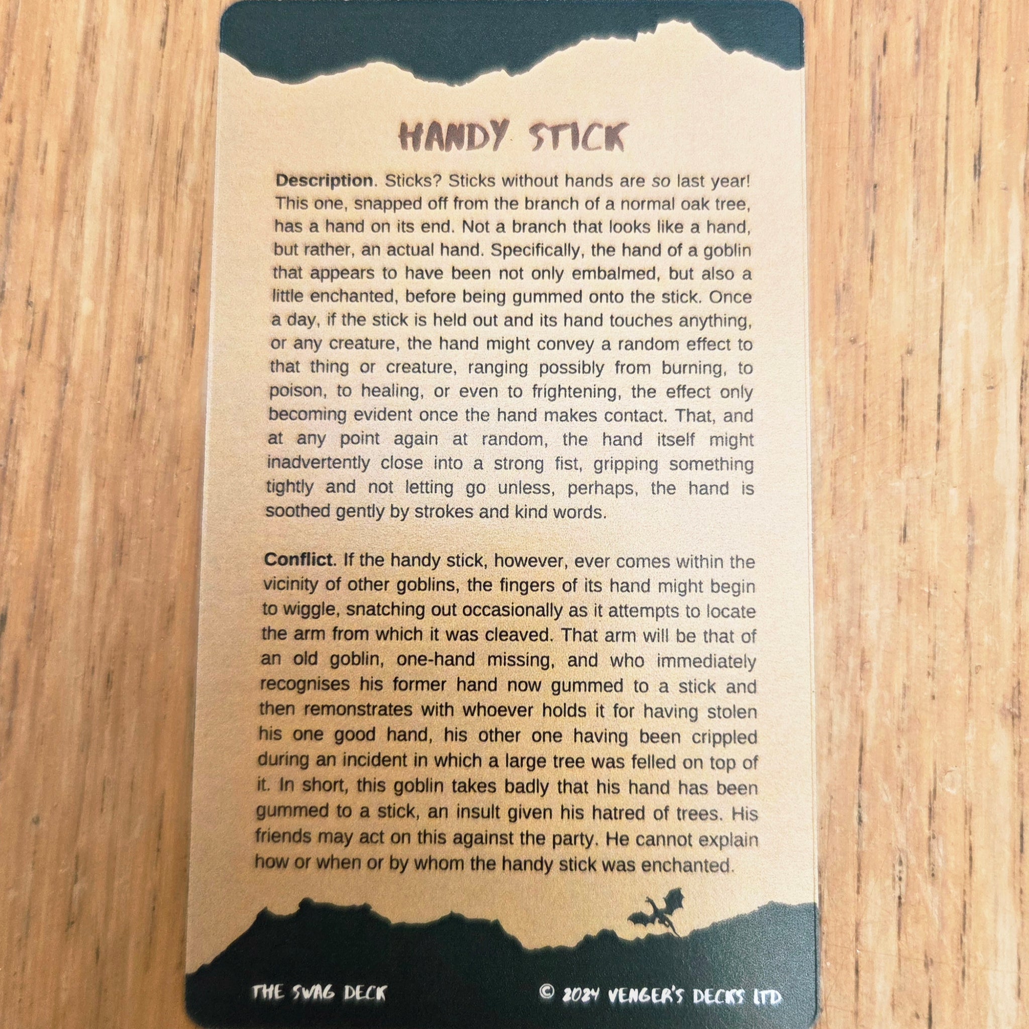 Each card in your deck lays out a unique magic or mundane item you can use in your game, something for your players to loot from a corpse or scene maybe, that item packed with hooks, conflicts, and 100% inspiration to make it more memorable and useful for what's happening in the game.